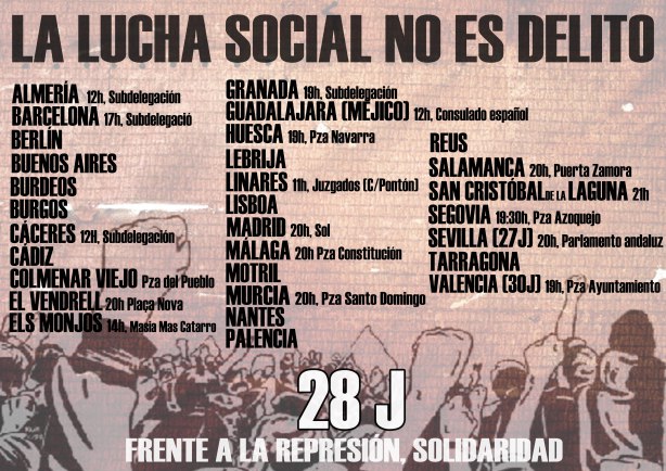 El 28 de Junio va a ser un día de lucha internacional para ejercer la Solidaridad (con mayúsculas) contra estás políticas delictivas que están practicando los diferentes gobiernos. Es un día contra la represión, es un día de lucha para exigir la libertad de las personas encarceladas, encausadas, maltratadas y humilladas por ejercer derechos como la libertad de huelga, de reunión, de manifestación, de expresión … Derechos que son de todas y de todos, pero que solo algunas/os comprometen sus vidas en defenderlos.